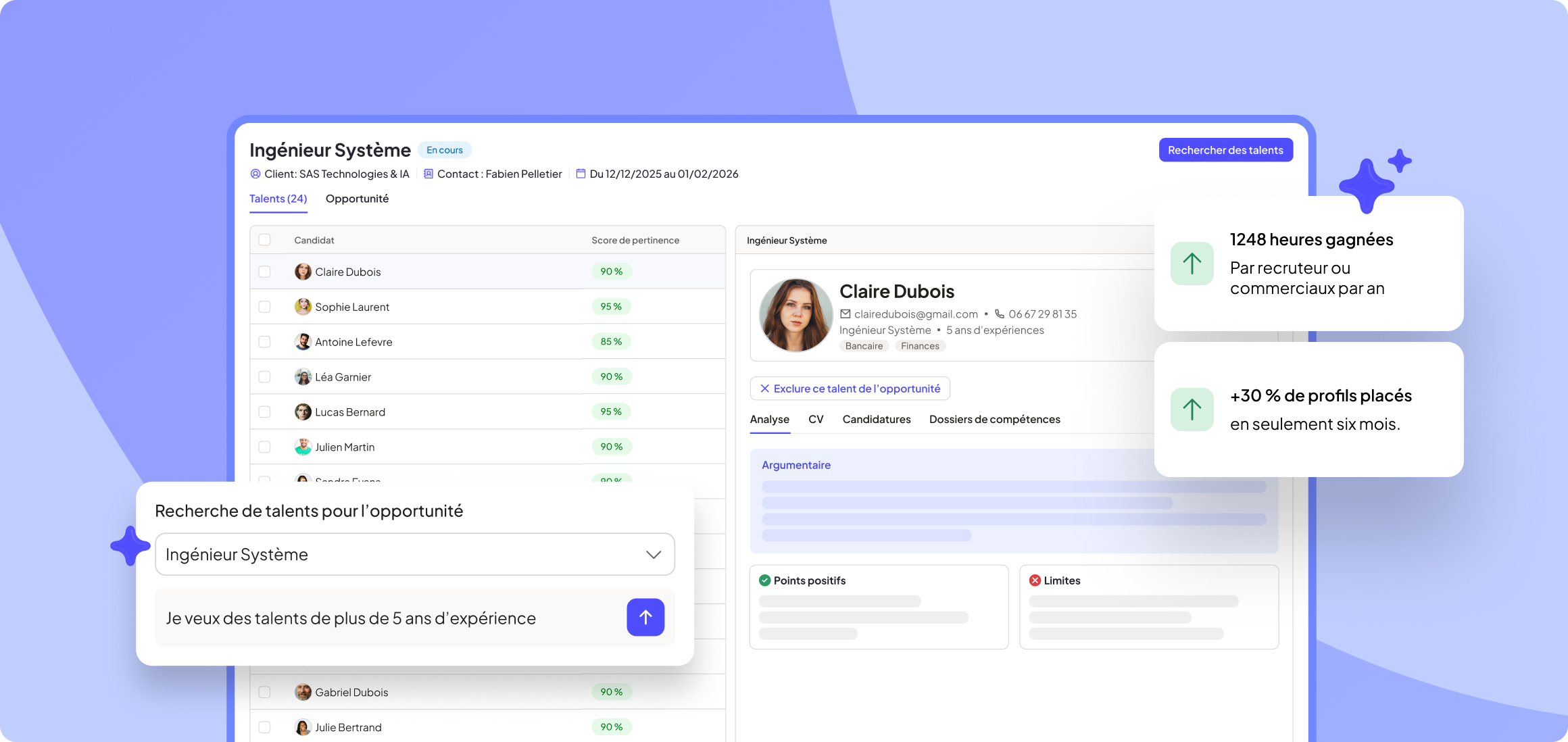 Grâce à la puissance de l’IA, scannez en profondeur votre base de candidats, et répondez plus rapidement aux demandes clients.
